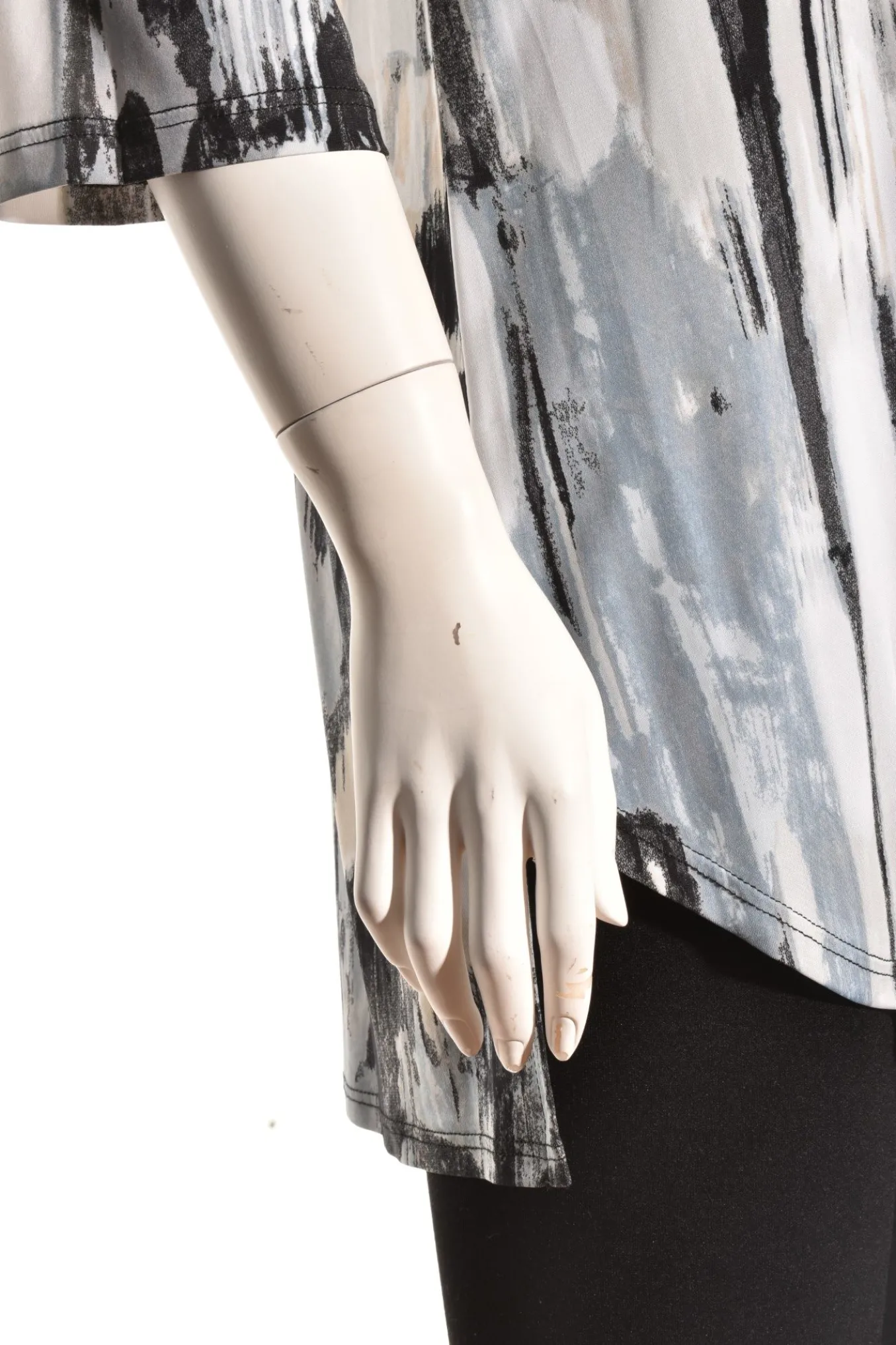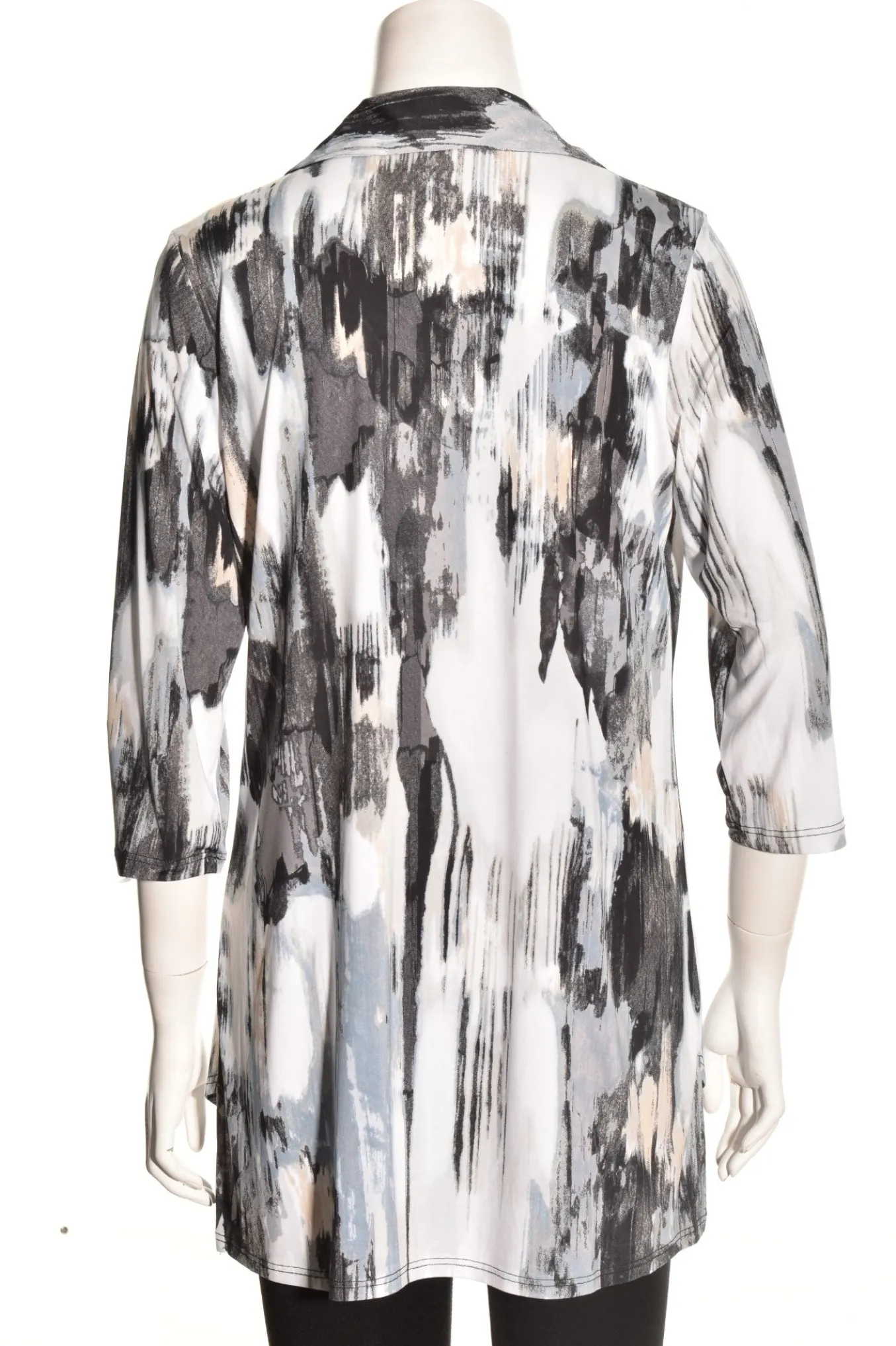 Another Travel Friendly Tunic By Caribe, This Pullover Collared Tunic In A Contemporary Brushstroke Design. Details Include An Open V-Neck Pointed Collar, 3/4 Length Sleeves, A Slight A-Line Silhouette With A Subtle High-Lo Hemline That Curves In The Front And Is Straight In The Back.