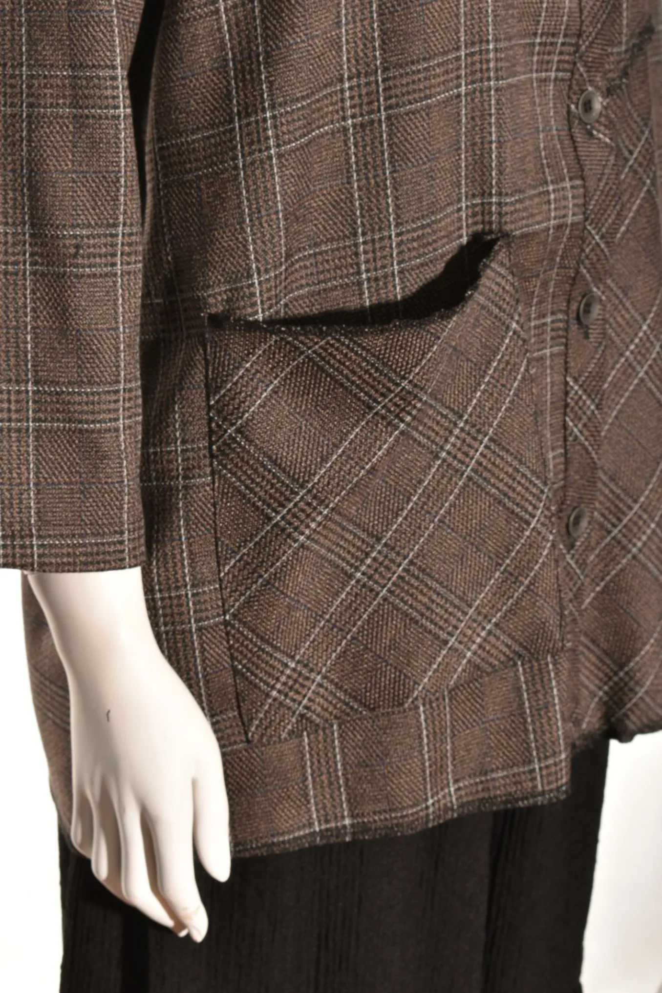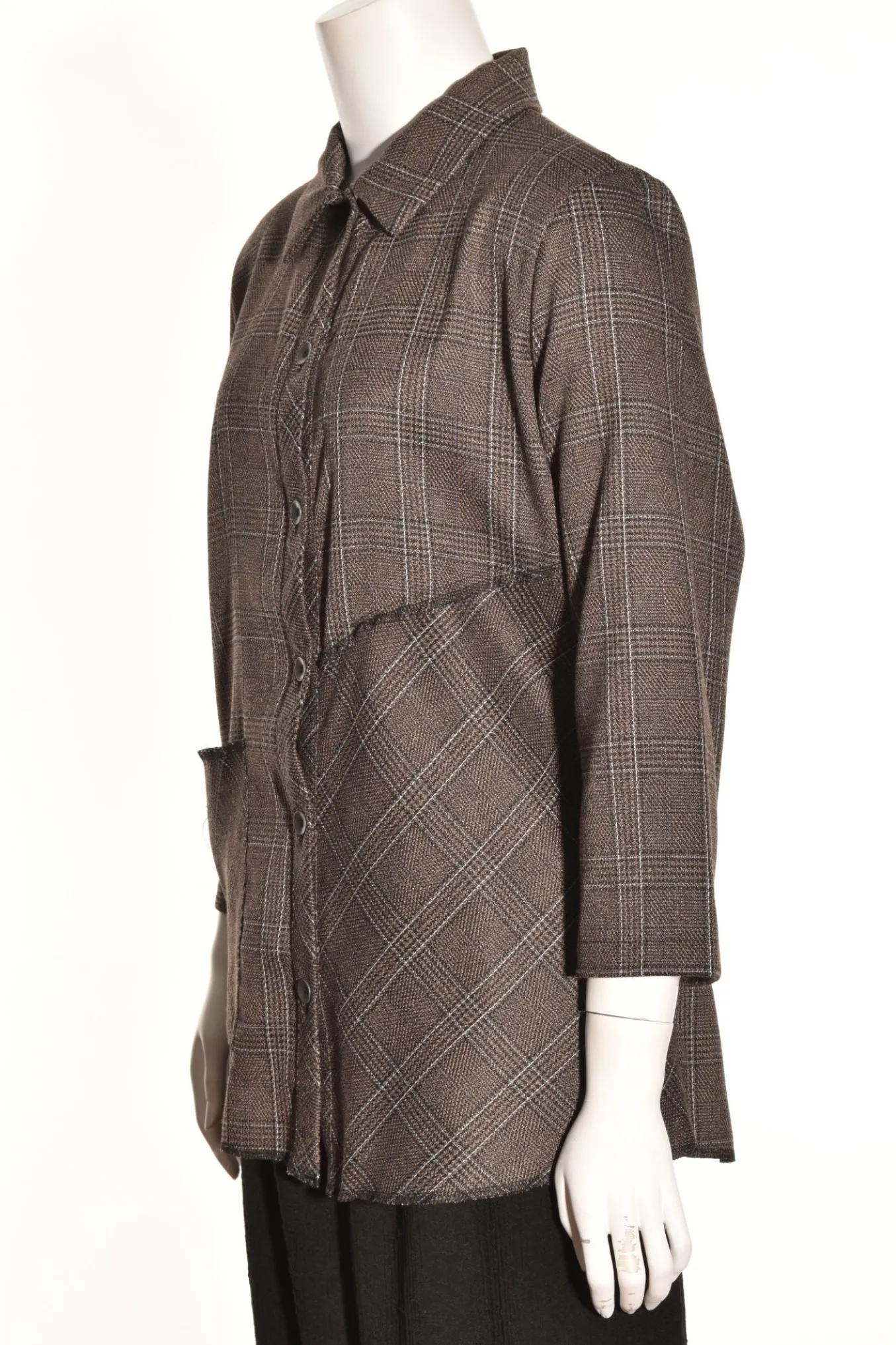 A Blast To The Past Mixes With A Modern Vibe With This Plaid Shirt. A Straight Silhouette With A Full Button Front, Pointed Collar And 3/4 Length Sleeves. A Large Patch Pocket On The Right, A Reverse Raw Edge Seam Adds Updated Details To The Vintage Feel. Another Raw Edge Seam Runs Across The Back And A Pleat Gives Shape.