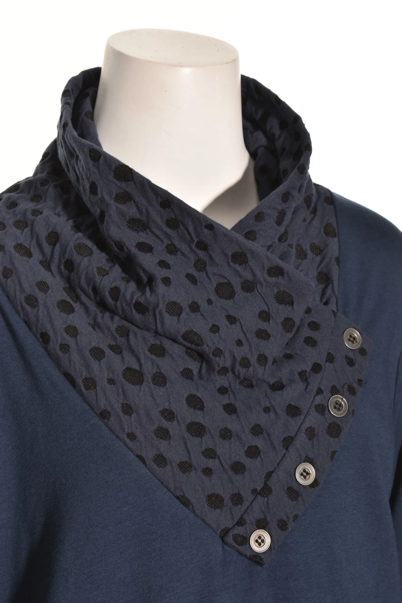 This Fabric Has A Cozy Quilted Texture. The Frances Tunic Has Complimentary Contrasting Mix On Fabrics. The Flattering Neckline With Dots Has Four Metal Buttons Purely For Decorative Appeal. A Curved Seam Separates The Dotted Bottom And Features One Pocket On The Seam. The Length Is Longer And Has Full Length Sleeves For Ultimate Coziness When Jack Frost Comes Knocking.