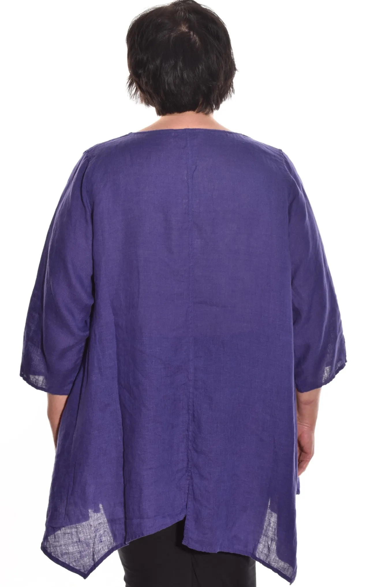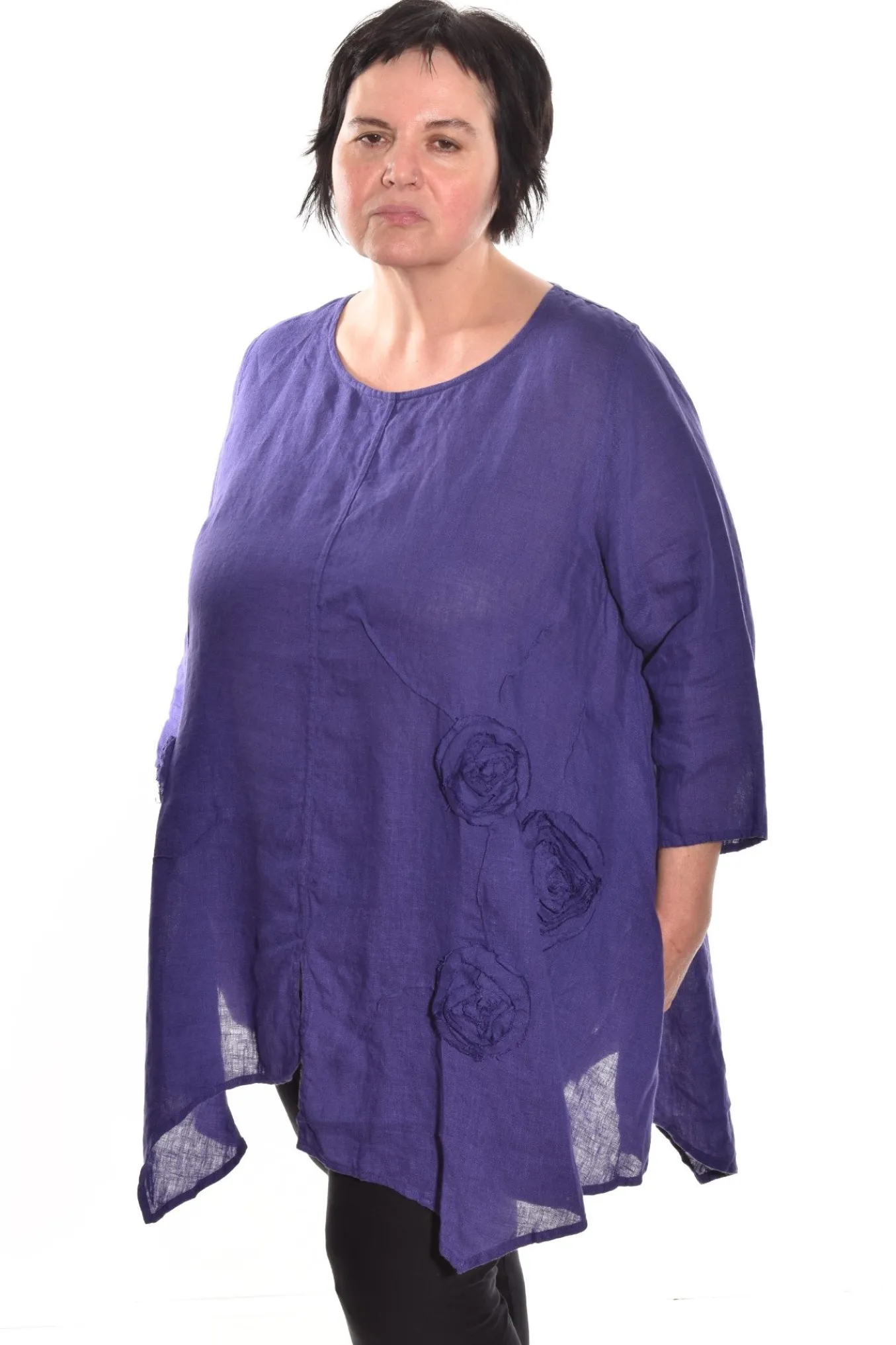 The Rosette Tunic By Cheyenne Has An Oversized Silhouette With A Series Of Pleats And Rosettes Which Elevates This Linen Top. An A-Symmetrical Hemline Adds Further Detail. With A Scoop Neckline And 3/4 Length Sleeves. We Love This Top In Purple.