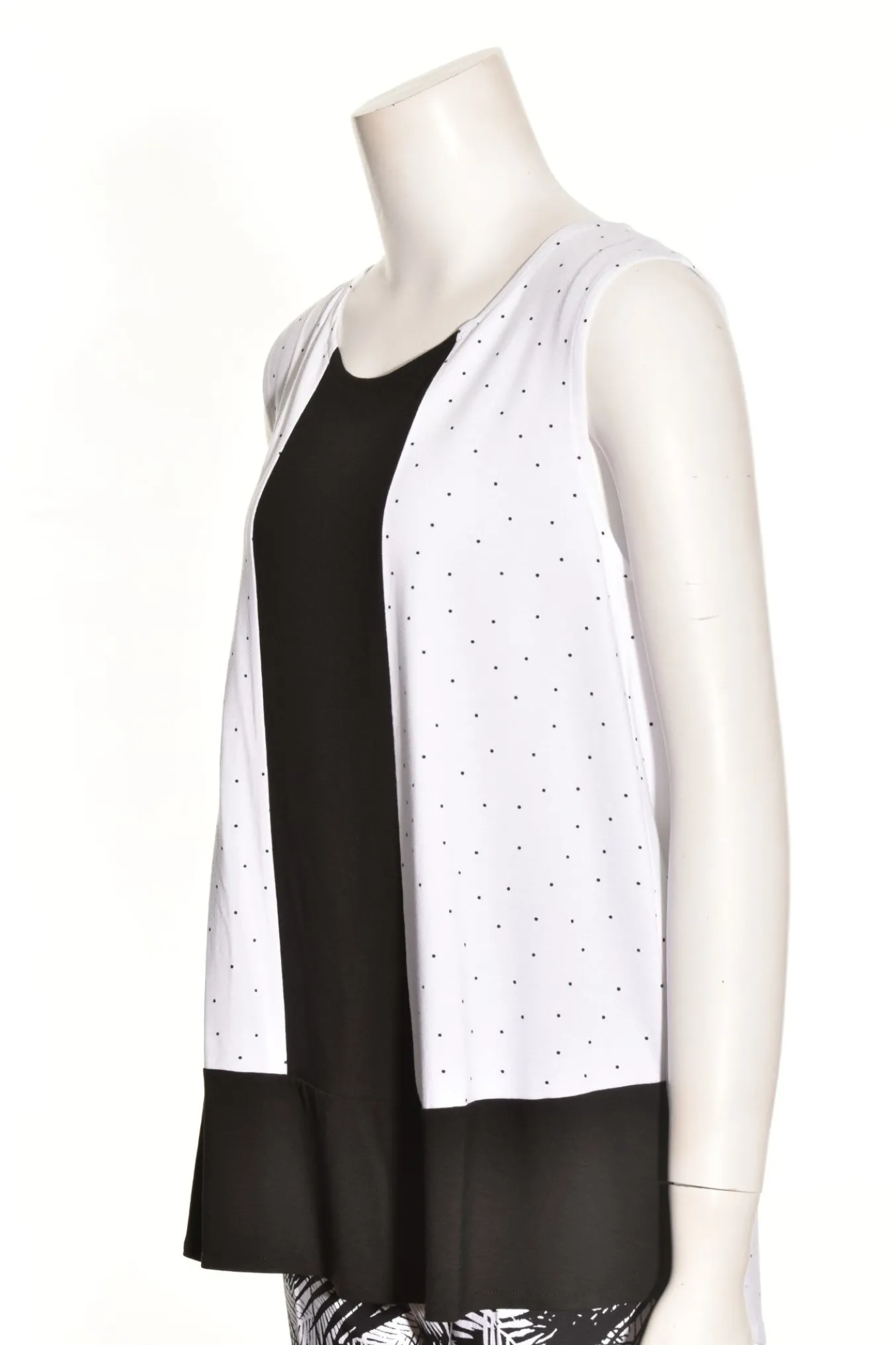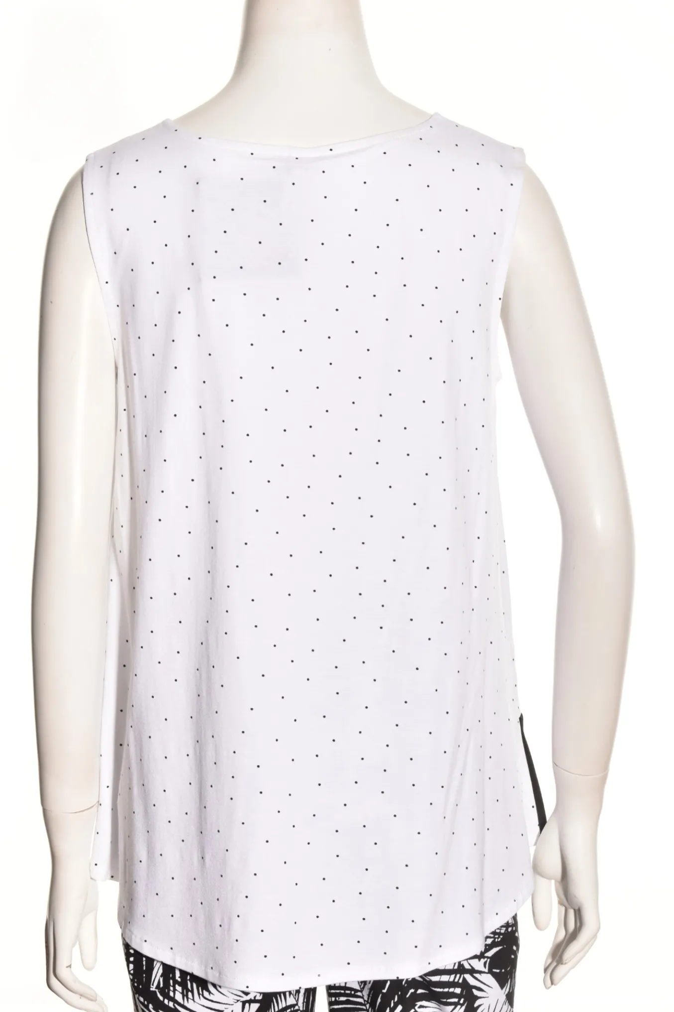 This Tank Effortlessly Wearable, An A-Line Silhouette, Swiss Dots All Over Complimented With A Color Block Of Black Down The Front Center And At The Front Hem.