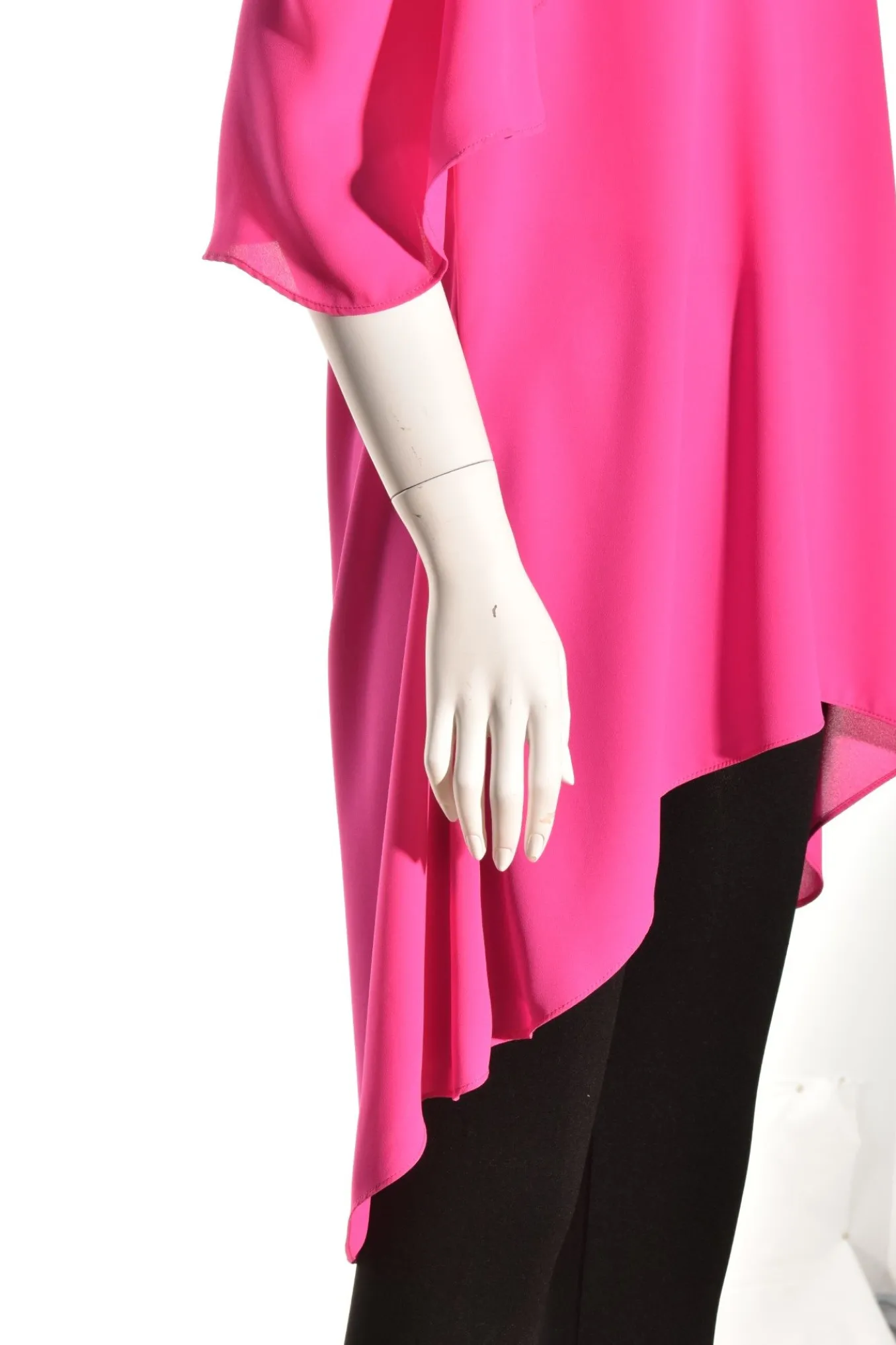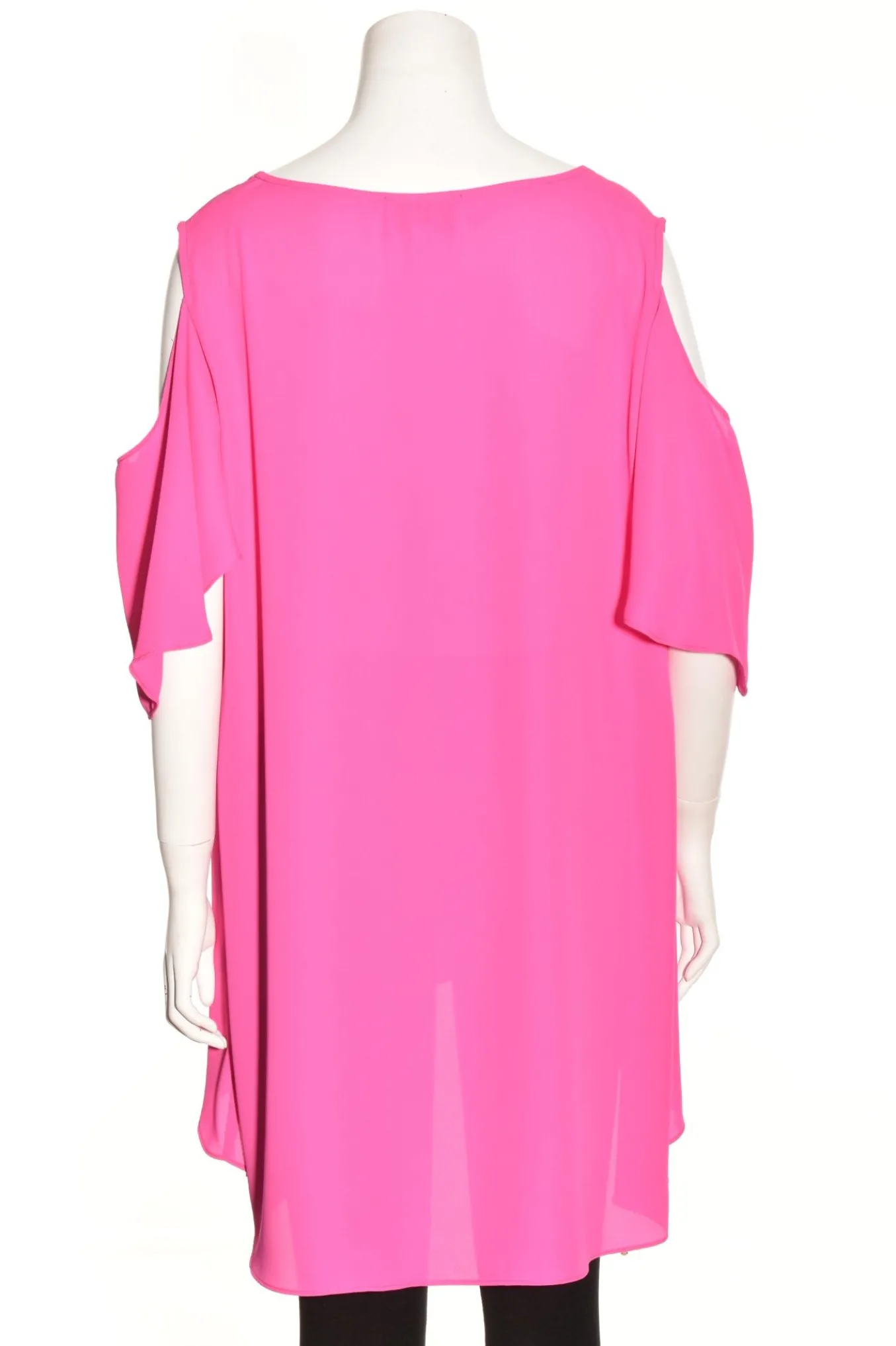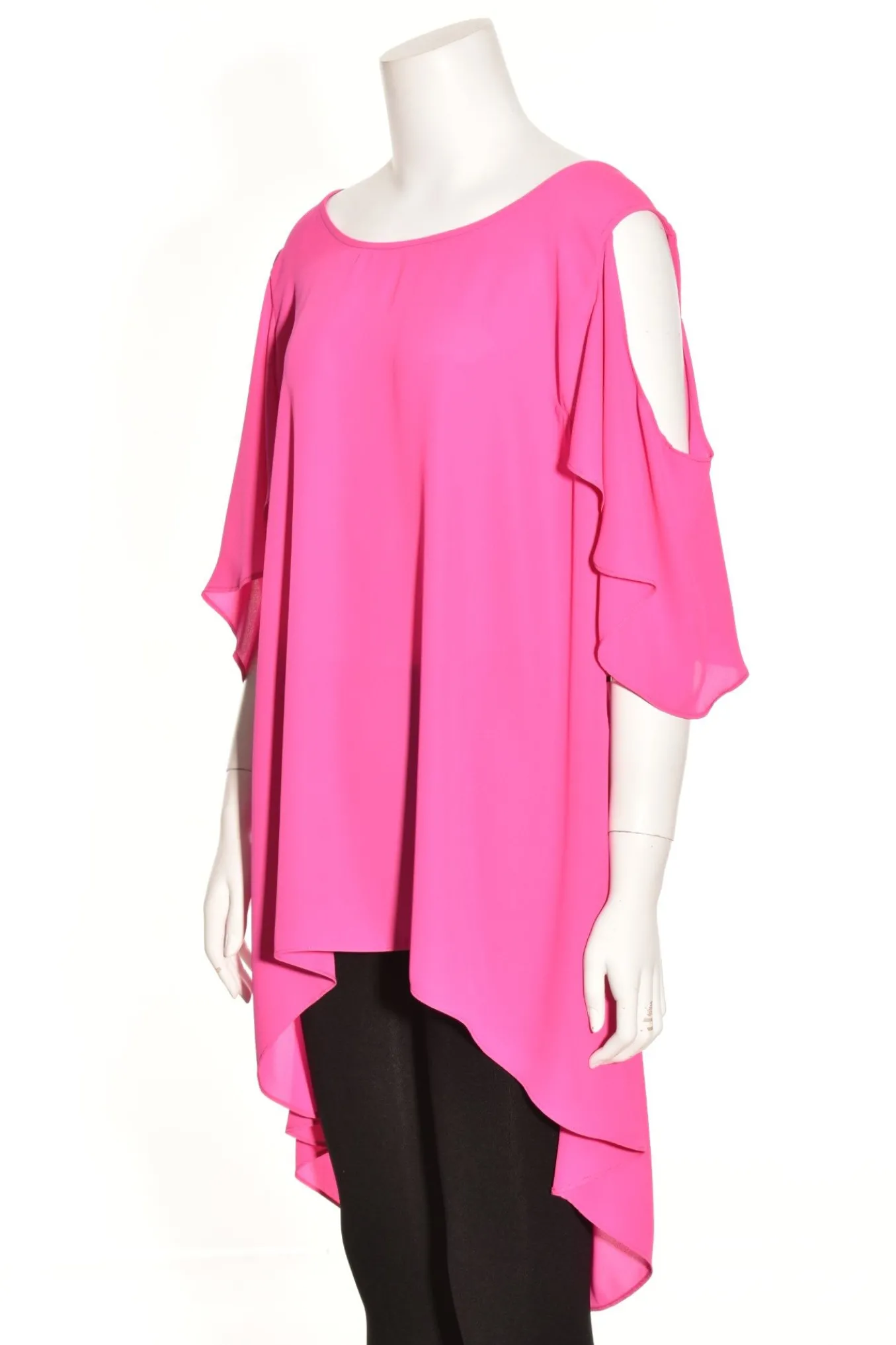 Calling All Vibrant Lovers Of Color! This High-Low Hem Tunic Features Cold-Shoulders, Scoop Neckline, Short Flowy Sleeves And A Shift Cut Which Hits Just Below Most Everyone’s Hip. This Gorgeous Top Available In Fuchia. This Top Has Great Movement And Flow In The Suvblime Georgette.
