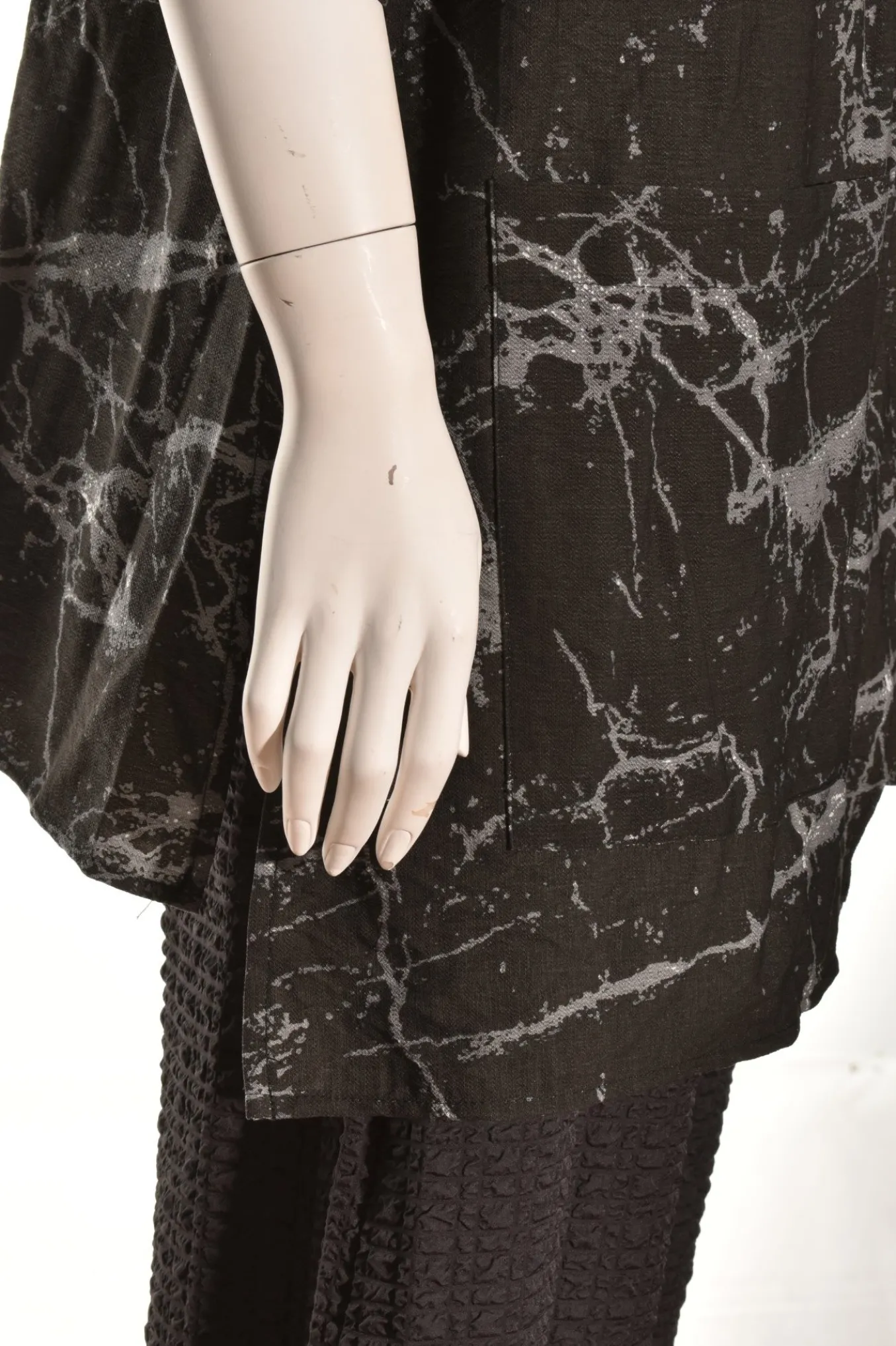 The Reef Has A Woven Rayon Crepe Has A Loose Yet Still Follows The Shape Of Your Body In A Figure-Flattering Way. Details A Banded V-Neckline And 3/4 Lebgth Sleeves Featuring A Generous Front Pocket And Slits At Both Sides And Center Of Front And Back. The Staggered Hemline Is Shortest On The Left Side. Made Up In A Sophisticated Marble Print Of Black And Grey With Just A Little White.