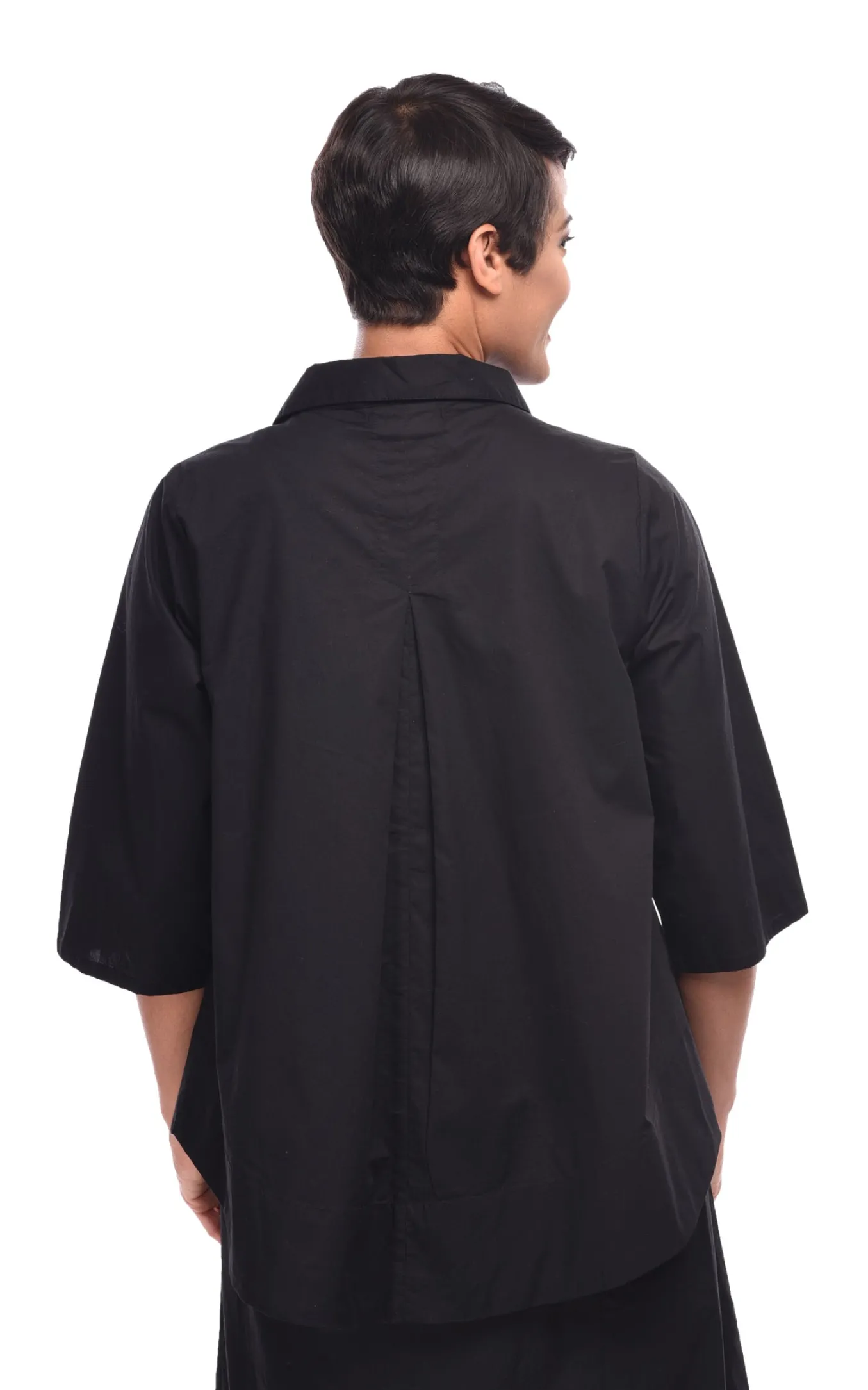 The “Alice Shirt”, A Loose Fitting Top With A Contemporary Vibe. This Crisp 100% Cotton Top Has A Hidden Button Placket And A Curved Hemline That Dips Slightly Lower In The Back. Details Include 3/4 Length Sleeves, A Center Pleat In The Back, And On Seam Side Pockets. In A Sophisticated Solid Black.