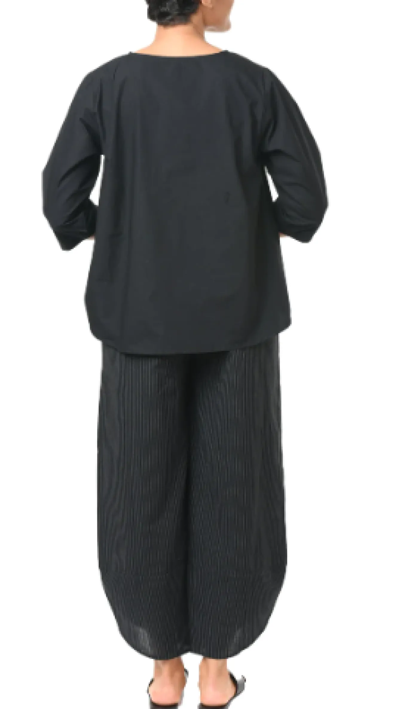 Light And Airy, This Comfortable Lightweight Pant Has A Full Elastic Pull-On Waist With Curve Edged Side Pockets. The Full Pant Tapers In At The Ankle With A Tulip Shape. The Hemline Is Slanted With An Overlapping Slit Adding More Detail To This Fun Pant In Manchester Stripe Design.