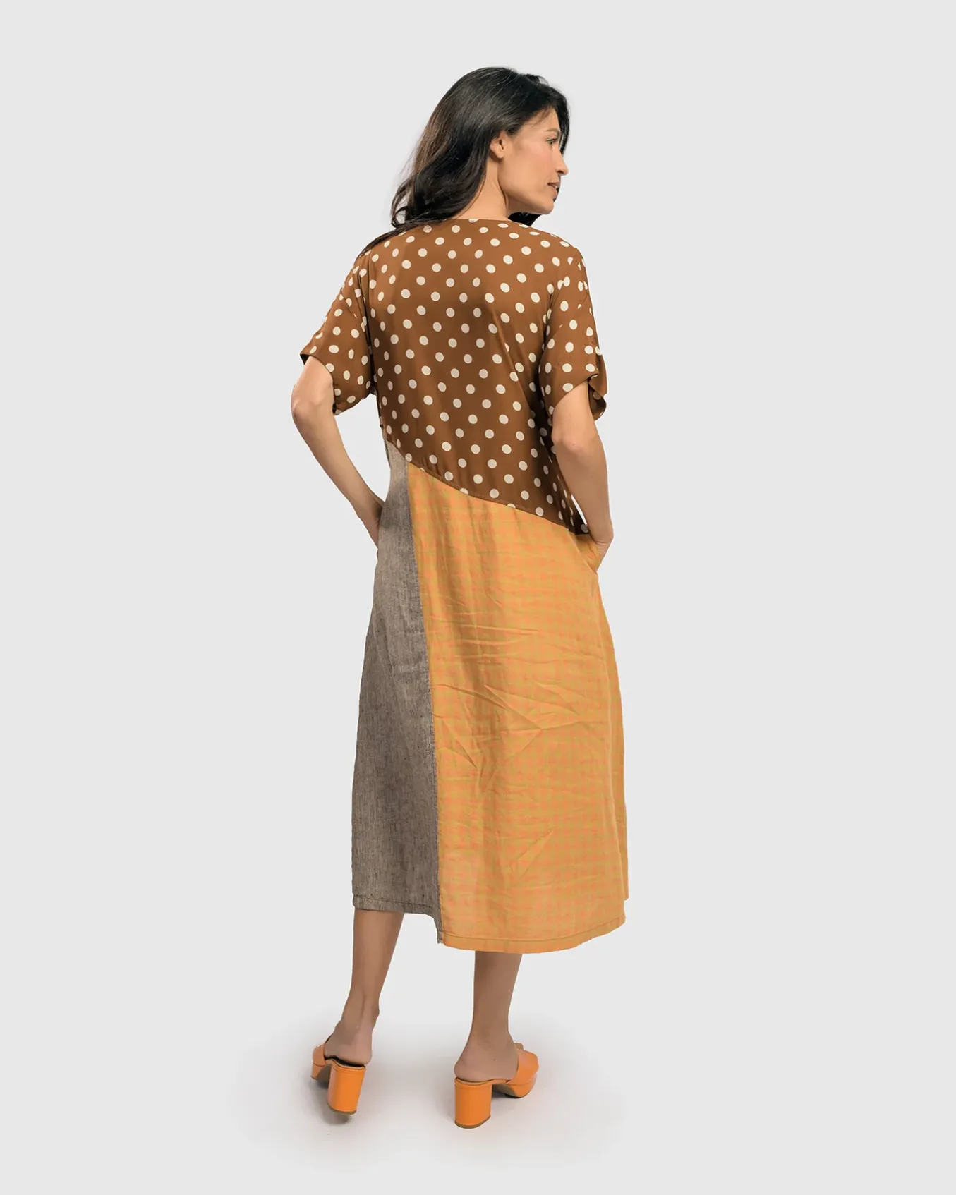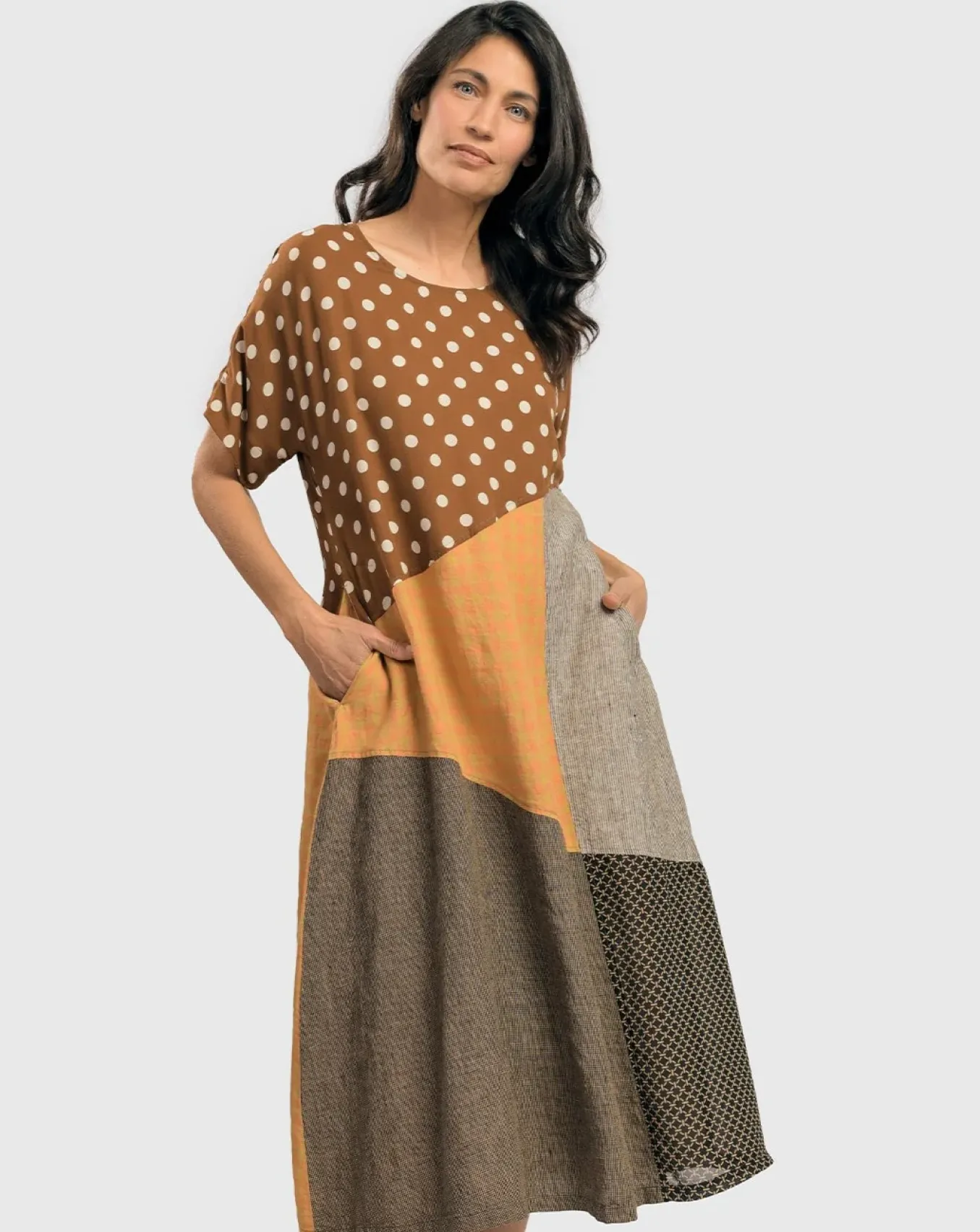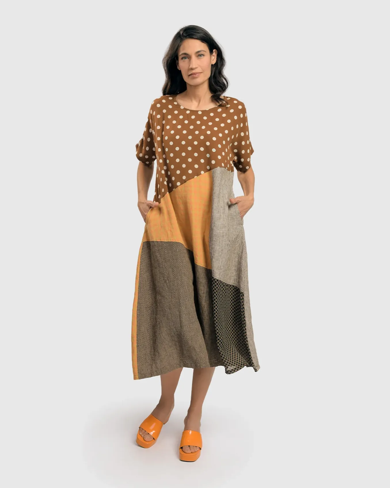 Dots With Dash… Dress Up For Any Spring Or Summer Event In This Breezy A-Line Silhouette That Skims The Ankle. A Mix Of Subtle Pinstripes, Checks, And A Sweet Dot Come Together In An Easy Pullover With Scoop Neck, Short Sleeves, Impeccably Tailored Piecing And Side-Seam Pockets. Beautiful!