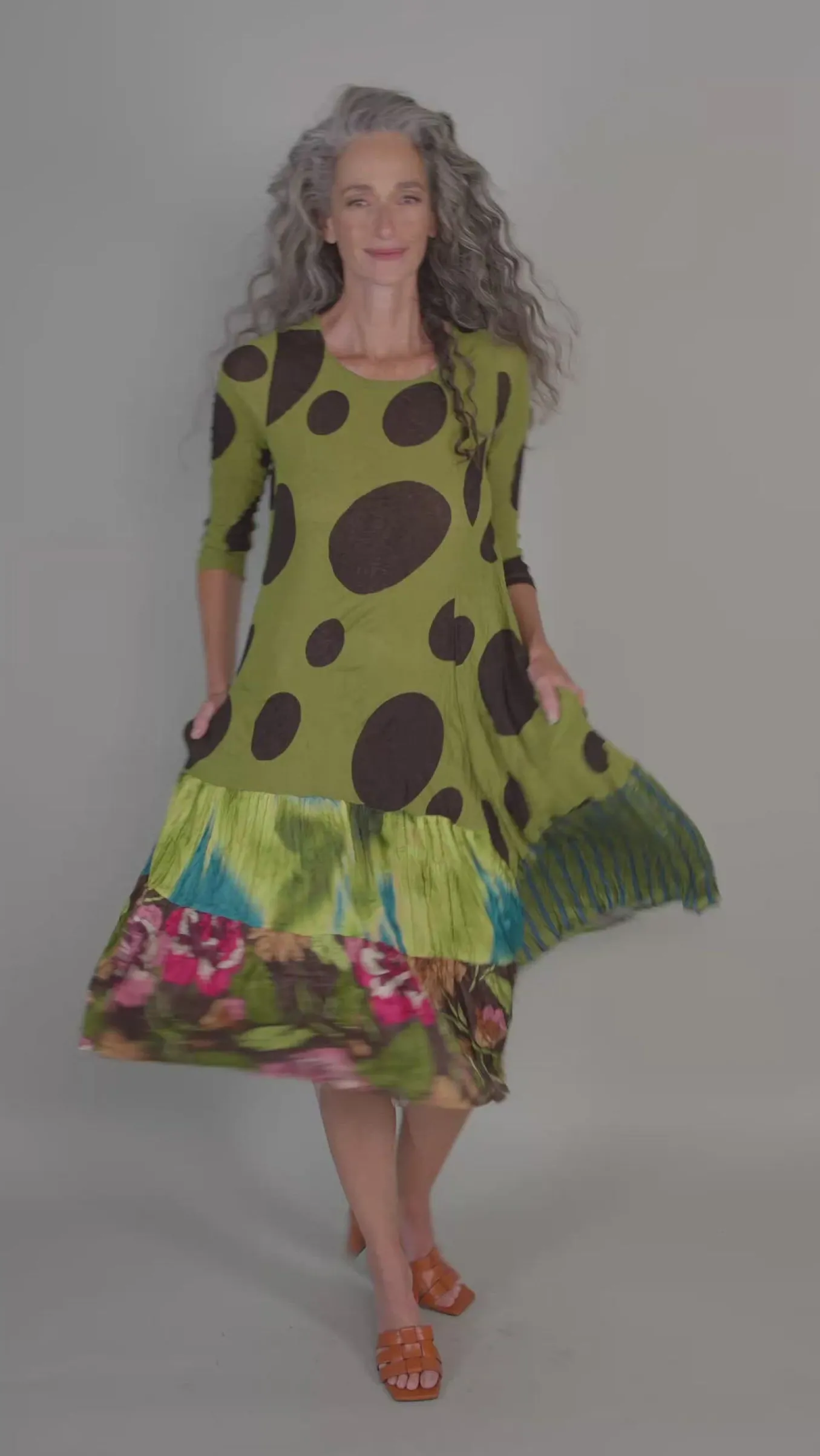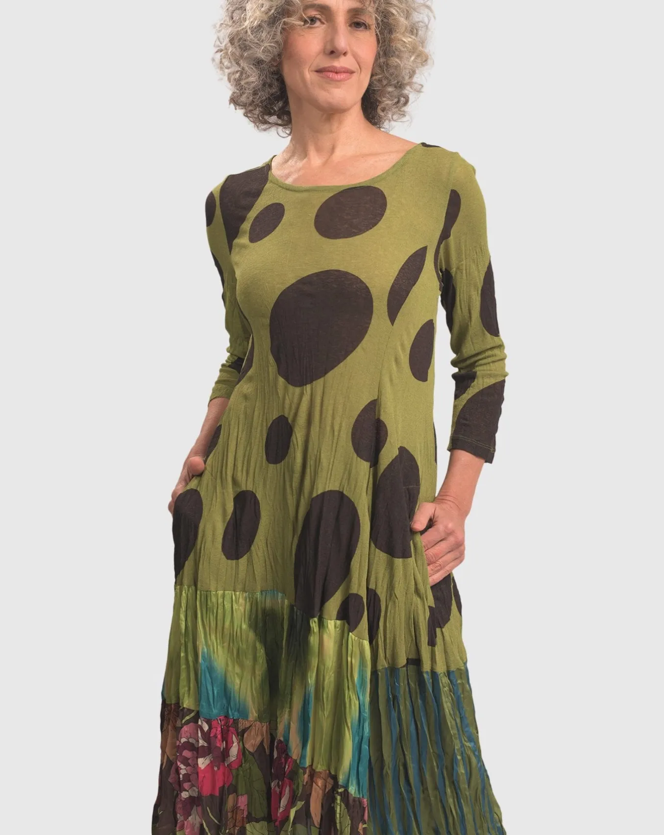 An Eye-Catching Mix Of Exclusive Prints, Artfully Pieced Together In Two Great Fabrics. The Figure-Skimming Knit Bodice With Scoop Neck And Three-Quarter Sleeves Tops Softly Crinkled Skirting Cut For Flirty Swing. Finished With Side Pockets.