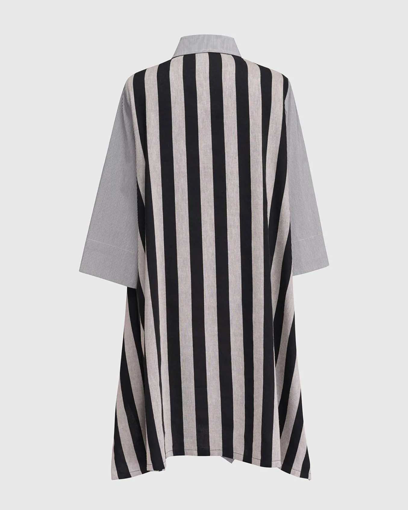 This Chic Oversized Tunic By Alembika Has An Artful Mix Of Pattern And Fabric. Classic Button-Down Styling With A Poitned Collar, Three Quarter Length Sleeves And Side Vents. Two Front Patch Pockets For The Win.