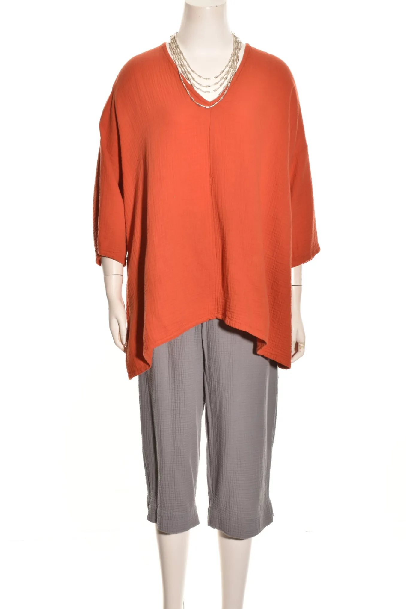 The Baxter Tunic By Bryn Walker Is Made Up In Lightweight Linen For A Breezy And Cool Look That Will Easily Style With You Existing Wardrobe. The Short Sleeve V-Neck Top Has A Ceter Seam Front And Back And A Hemline That Falls Slightly Longer In Back And The Sides. We Paired Her With Bryn Walkers Casbah Pant, Style #7024, In Color Quill.