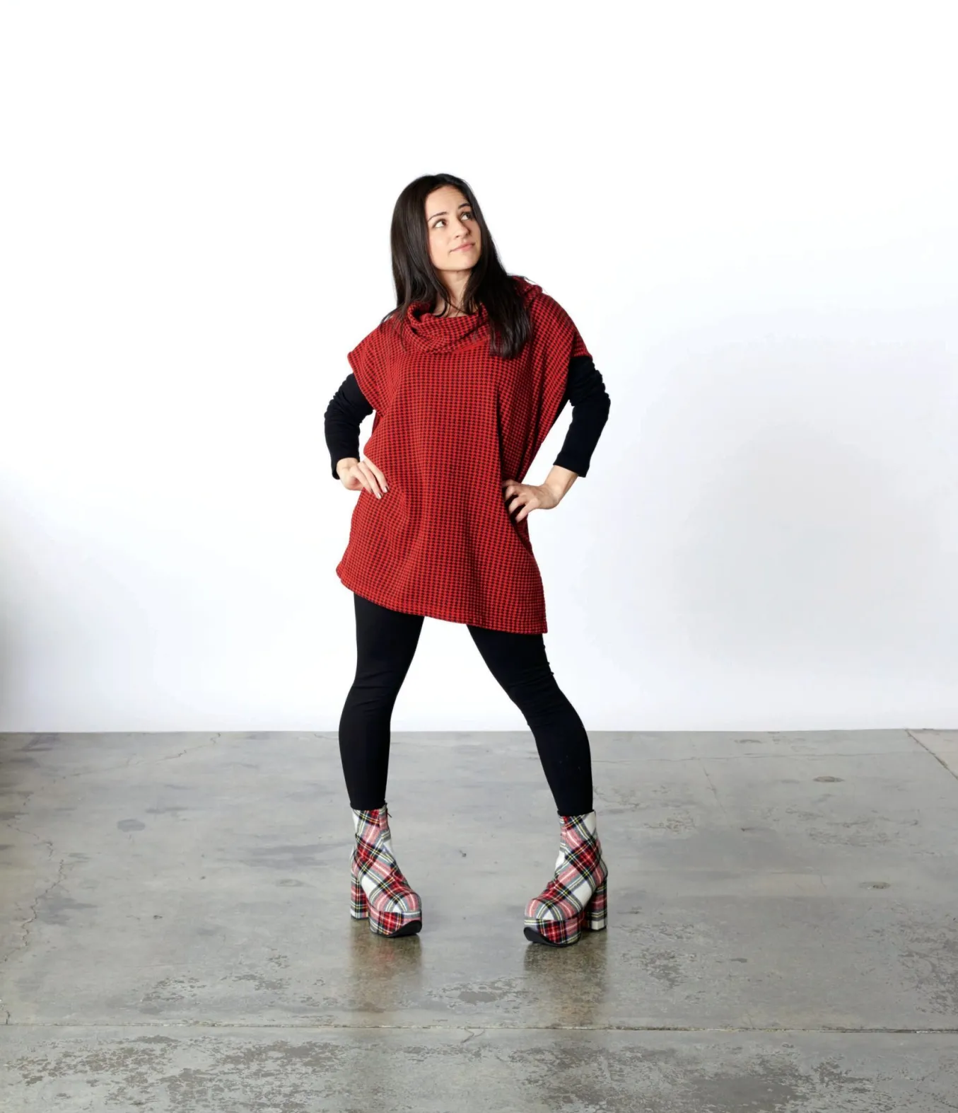 Cozy Up In The Pike Poncho By Bryn Walker. Made Up In Their Super Soft And Cozy Bamboo/Organic Cotton Fleece. The Vibrant Hounds Tooth Pattern Of Red And Black Pops And Layers Beautifully Over A Long Sleeve Black Top And Black Leggings. This Essential Layering Piece Is Tunic Length And Has A Boxy Silhouette With Side Vents For Ease In Movement. A Large Kangaroo Pocket And Dramatic Cowlneck Complete This To Perfection.